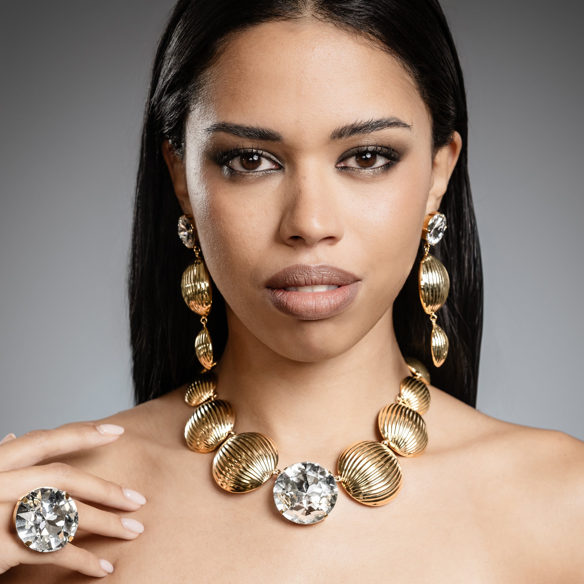 Realizzata a mano in ottone galvanizzato oro e arricchita da un prezioso cristallo da 3,5 cm, questa collana si distingue per la sua forma unica e il luminoso effetto del metallo rigato.